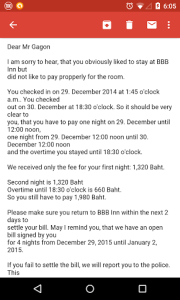 Ayant assidûment payé mes deux luxueuses nuits (et ayant de surcroit moi-même passé pour un amateur de phallus d’adolescents), je suis retourné au BBB Inn pour m’obstiner avec le proxénète gérant. Et éviter de me ramasser avec la police thaï sur le dos !