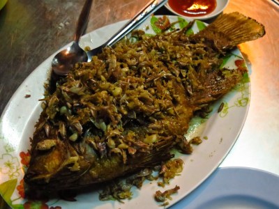 Au marché de nuit d’Ayyuthaya, l’incroyable Richard et moi-même avons mangé comme des cochons (il aime bien manger du Thaï Paï, comme il dit !). J’avais pas encore essayé de poisson en Thailande. Pis ceux déposés sur la glace avaient l’air pas mal frais. Ça fait que j’ai pointé du doigt ce que je voulais au cook, parce qu’on pouvait pas communiquer vraiment autrement.