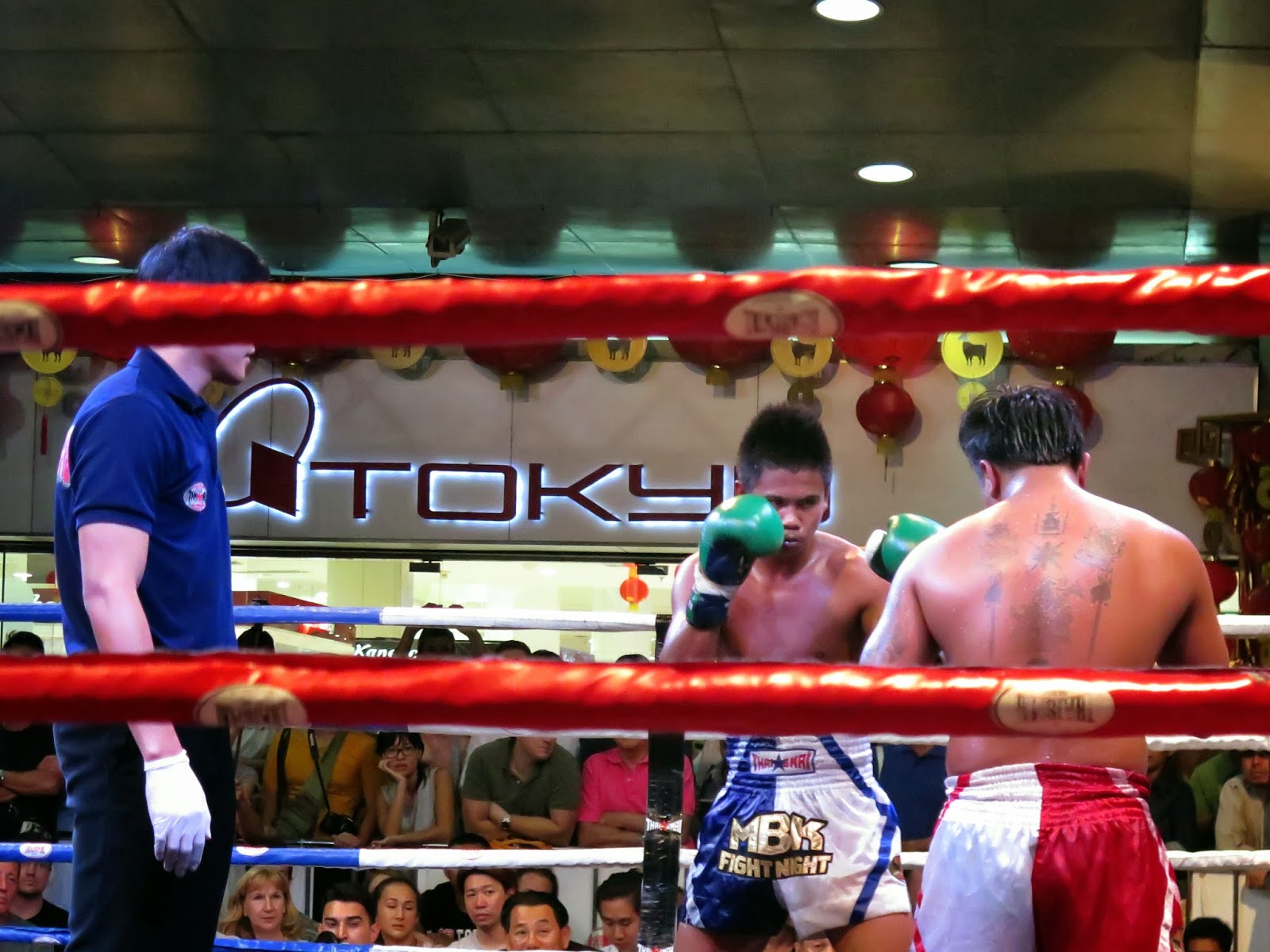 Kham avait pas besoin d’un cours classique pour comprendre que quand on a deux jours à Bangkok, faut faire un concentré d’activités pour en voir le plus possible. S’t’un pro, pis moi ben j’étais d’accord avec lui. Ça fait qu’on est aussi allés voir de la boxe thaï. C’est un peu l’équivalent du kick boxing, sauf que y’a de la cornemuse qui joue tout le long. Le monde boit et crie autant que les québécois pendant une game du Canadien contre les Giants (on voit ici mes immenses connaissances en sport professionnel), pis je me suis surpris à crier le nom d’un des boxeurs. Naturellement, par affinité logique, je supportais le plus mince des deux. Pis c’est lui qui perdu.